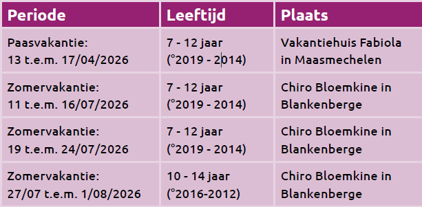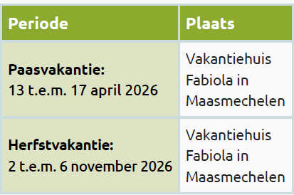 Kampen tijdens paas-en zomervakantie 2026 voor 160 kinderen van 7 t.em.14 jaar (geboren tussen 2012-2019) uit maatschappelijk kwetsbare gezinnen.