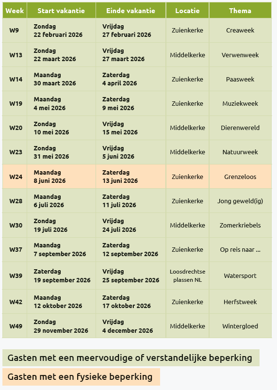 Tijdens iedere vakantieweek staat ‘grenzeloos genieten’ voorop! Voor enkele van deze vakantieweken is de doelgroep nog verfijnd of wordt er gewerkt met een thema.