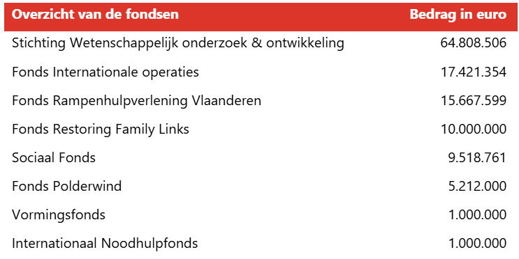 Belgian Red Cross-Flanders has a number of funds through which income from one-time gifts and bequests - as well as any positive annual results - are used to provide long-term funding for certain activities, as well as the implementation of our strategic plan. The funds make us less dependent on annual fluctuations in grants and declining government support. They are a guarantee that we can always continue to help and make it possible to initiate relief efforts at any time, such as acute post-disaster relief.